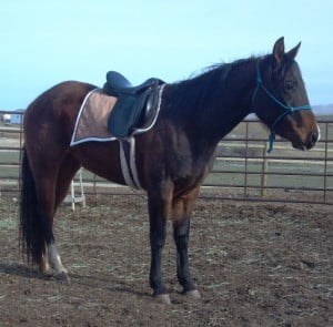 Biscuit, is a 3 year old bay thoroughbred/quarter horse mare.  She stands at about 14 hands and is as cute as a button.  She is a bit shy at first until she gets to know you and then is in your pocket. She has had some ground work in the past but needs a refresher.  Her foster family is working with her and handling her every day.  Biscuit is very intelligent and is a willing learner.  In the first two days at her foster home Biscuit had been introduced to the flag and saddle. She handled both very well with very little spook and no buck, she has now been saddled and ridden, took to it like a duck to water. Placed into a permanent home that will continue her training.