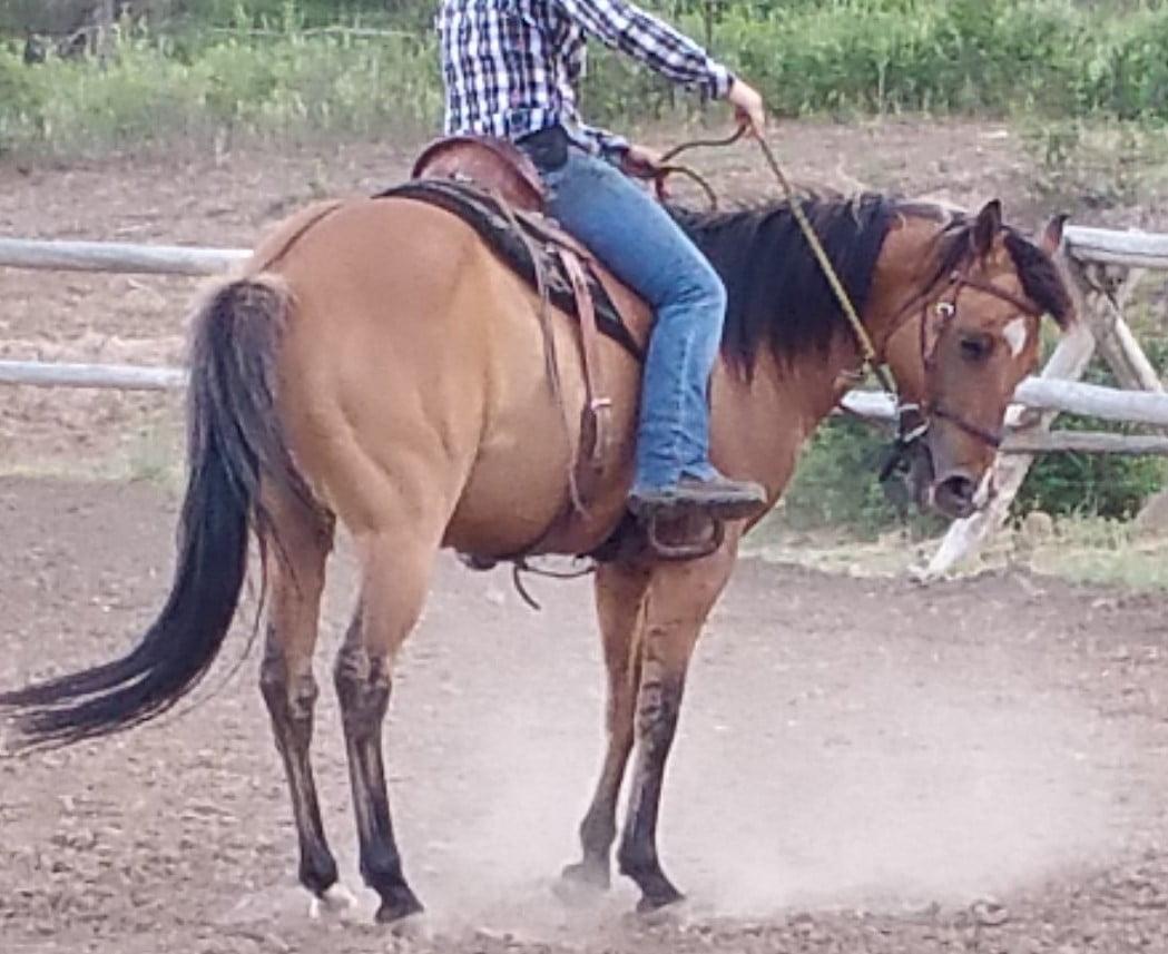 Caramel is a 9 year old, 14 hh Quarter Horse pony gelding. Buckskin dun with tiger stripes. I pulled him off the Zillah sale/kill pen in the summer of 2012. He has sustained an injury to his right hind hip while there but has recovered nicely. He has been ridden on trails quite a bit, has had arena work and while not polished, he is a boy that wants to engage and is willing. He has never been naughty under saddle and I can get on him and take him down the road when he’s not been ridden for months but he is not what I would call a beginners horse as he still has a lot to learn. He can also be a bit pushy with his head on the ground so he needs an owner who will not hand feed him or let him get away with not respecting boundaries.