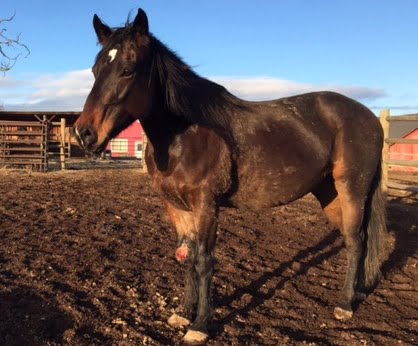 Destiny is a 10-12 year old QH mare, presumed to be pregnant by a TB stud. She came to RCER with a badly cut right knee and is currently under vet care. We have been told that she was lead around with kids on her, but do not know how well broke she is, will be assessed after she has healed.