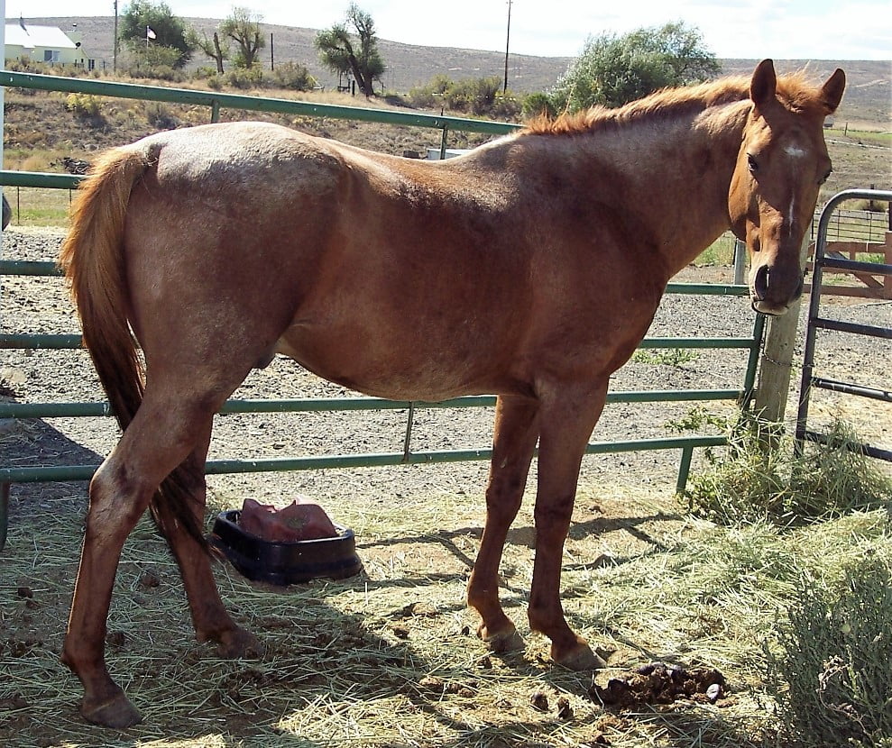 Ruger is a red roan gelding that is good to handle on the ground, easy to catch and hauls nice. Part of a law enforcement investigation, he was thin, in need of hoof care and being fed tree branches for his dinner. The vet has estimated his age at 10 to 11 years old. He is now current on worming, vaccinating and hoof care. Ruger is broke to ride, would make a nice 4-H or youth horse with a bit of reining training.