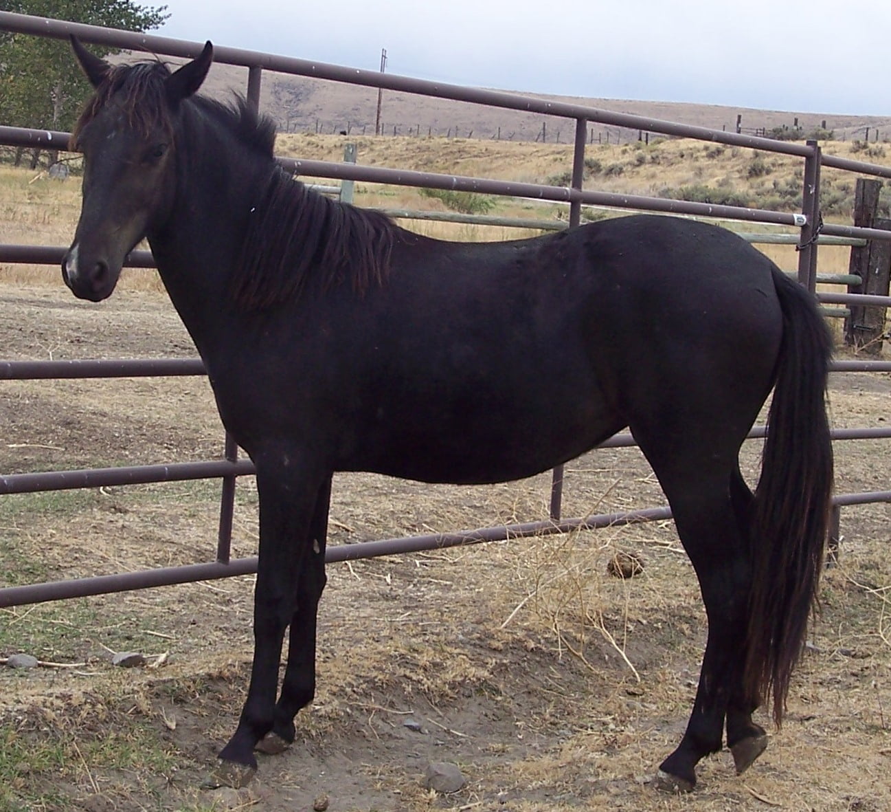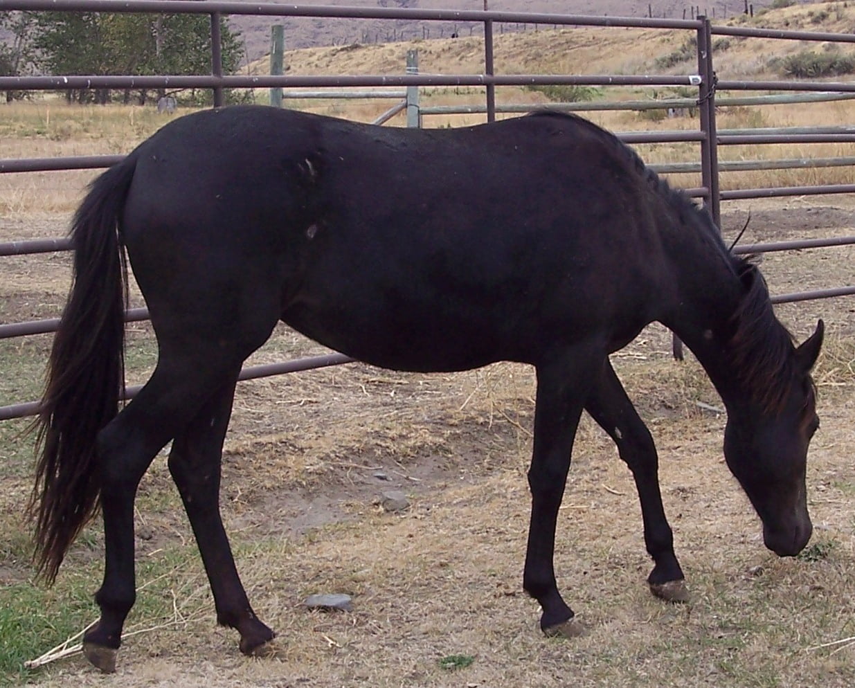 Serena is a young Black filly, possibly a long weanling. We do not know what month she was born in. She still has some fuzzes in her mane like a foal has. Serena had DNA test done and that came back as Paso Fino. She has the look and movement of a Paso.