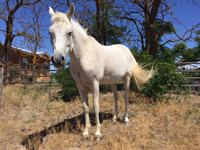 Sterling is a Welsh/ Arab cross gelding, considered to be a large pony at 14 hands. He is a flea bit gray and about 16 years old. In his former life he has been ridden by a young person in English walk, trot, English pleasure and some trail riding. Does a little better with a confident rider.